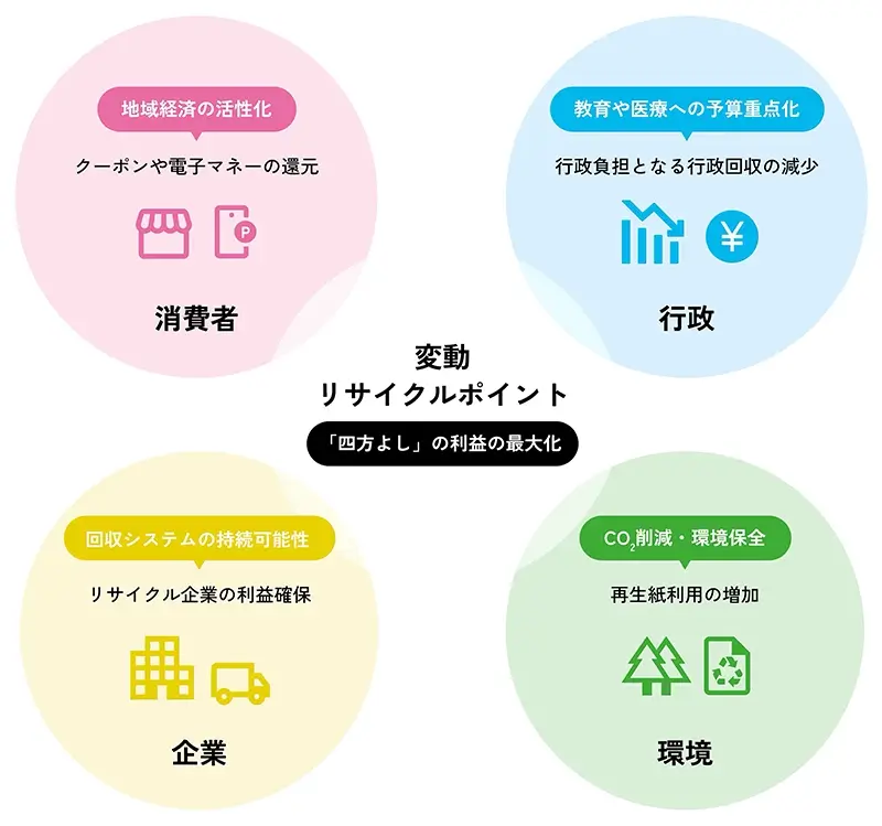 - 消費者によるリサイクルステーションへの資源物の持ち込みは、社会全体でリサイクルを増やしていくためにとても大切です。しかし現状では、いまだに多くの資源物が家庭ごみとして捨てられるか、善意であっても財政負担の大きい行政の資源回収に委ねられています。この実証実験では、日本で初めてリサイクルステーションに「変動リサイクルポイント」を導入します。AIが、季節や天気、ライフスタイルなどに応じたリサイクル行動の変化を学習し、消費者、環境、行政、企業の「四方よし」の利益を最大化するようにポイントを決定します。